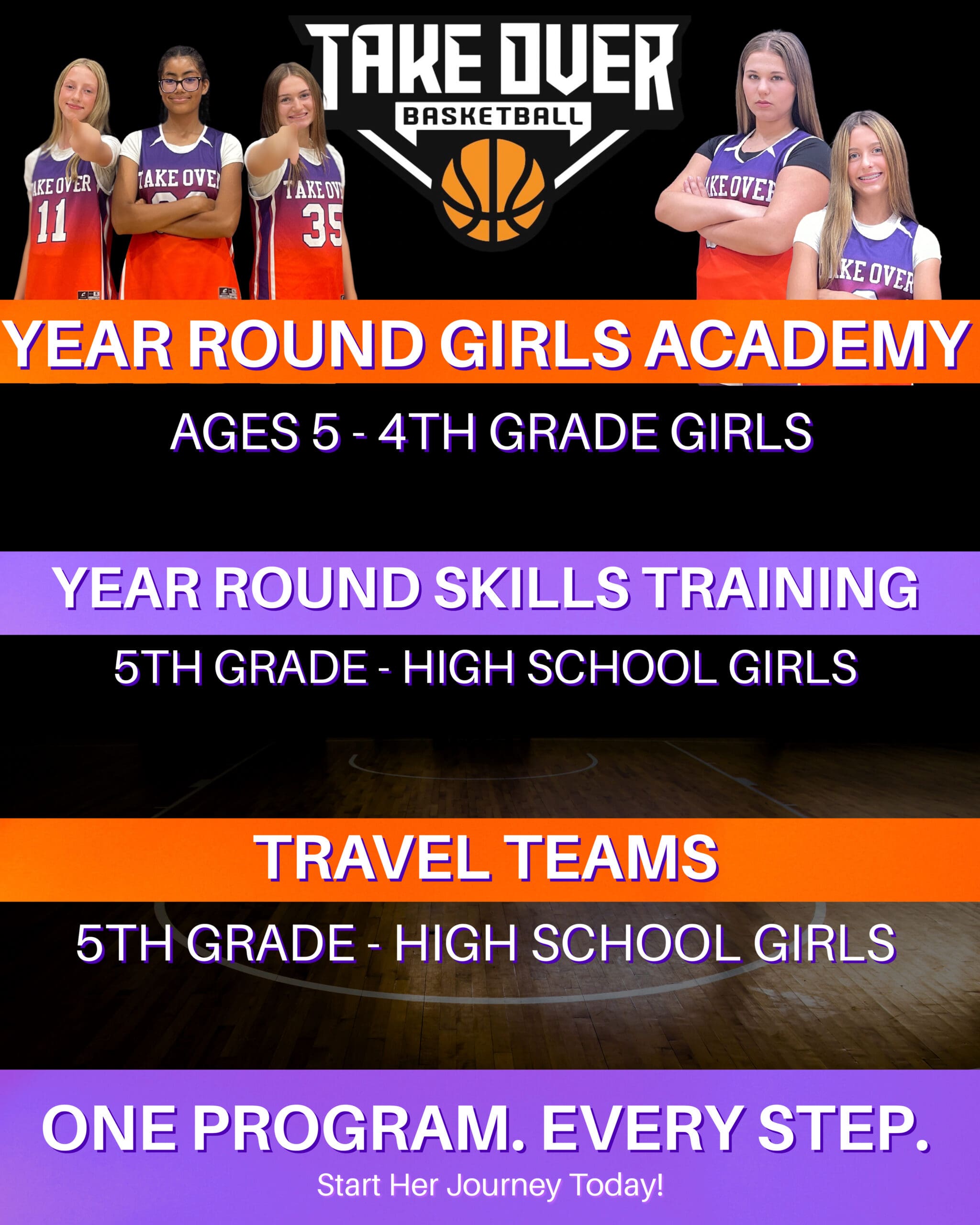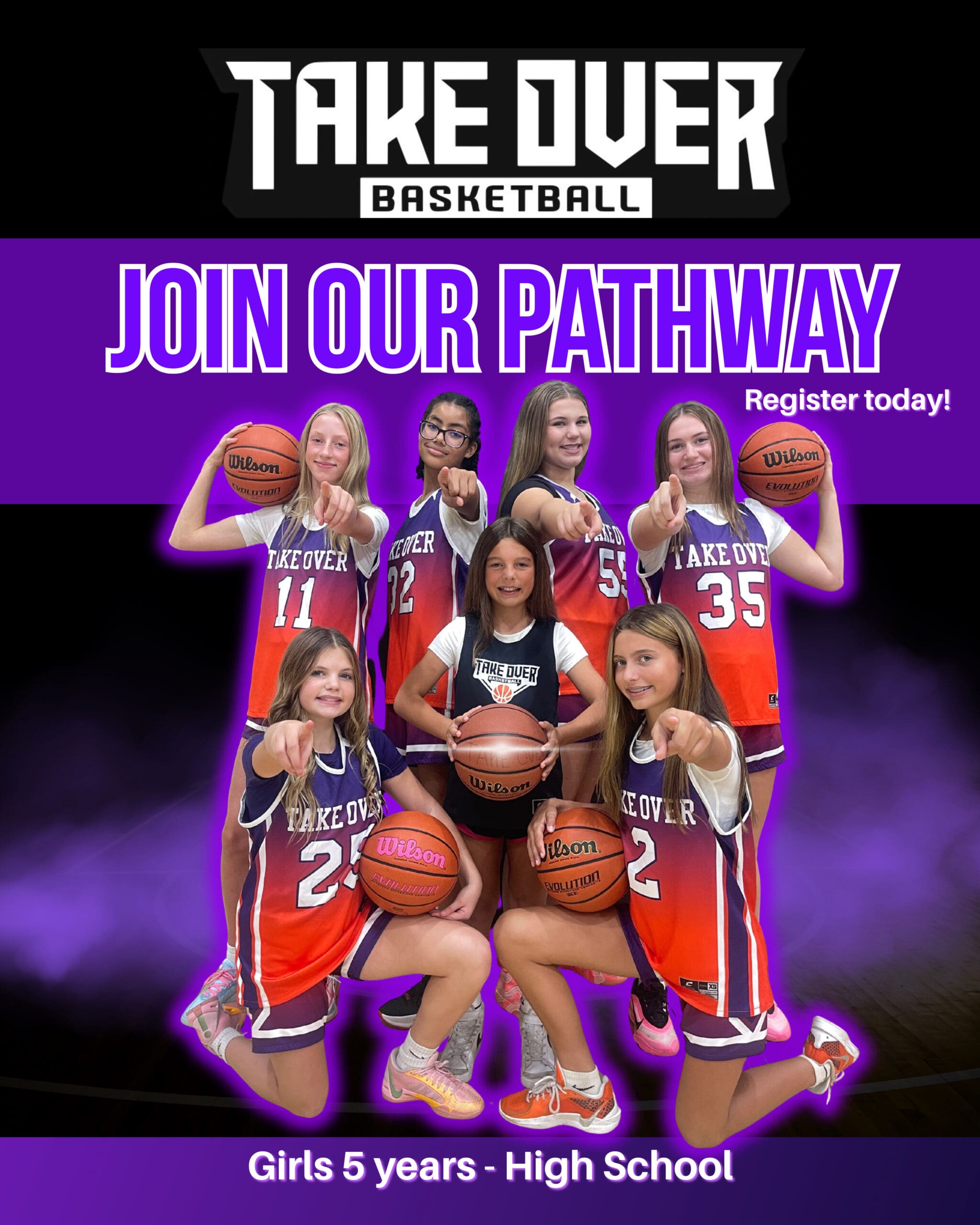 As part of our pathway, we encourage League players to also enroll in our Academy. The League provides real game experience, while the Academy is where girls learn and refine the fundamental skills they’ll use during those games. Starting in 5th grade, players will also have the opportunity to try out for Take Over Travel Teams — the next step in their basketball journey.